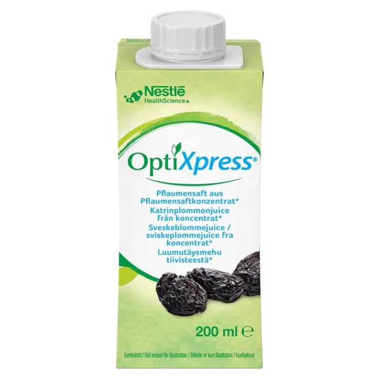 OptiXpress® ist ein 100%iger Pflaumensaft aus Pflaumensaftkonzentrat. Er greift auf die Tradition eines Hausmittels zurück, bei dem getrocknete Pflaumen in Wasser eingelegt und über Nacht konsumiert werden. Eine Verpackung OptiXpress® enthält Pflaumensaftkonzentrat (20g/100ml) aus getrockneten Pflaumen.