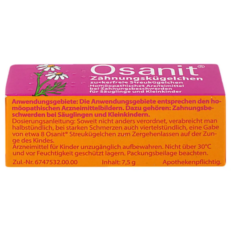 Osanit Streukügelchen sind ein homöopathisches Arzneimittel, zuckerfrei. Die Anwendungsgebiete entsprechen den homöopathischen Arzneimittelbildern. Dazu gehören Zahnungsbeschwerden bei Säuglingen und Kleinkindern.