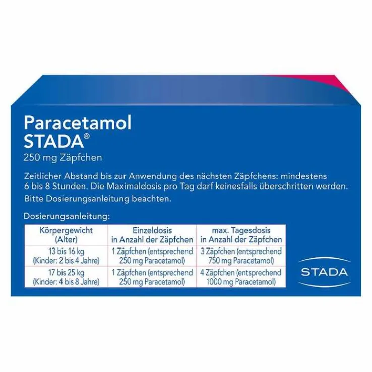 Paracetamol STADA® 250 mg Zäpfchen. Für Kinder mit einem Körpergewicht von 13 bis 25 kg (Alter: 2 bis 8 Jahre). Wirkstoff: Paracetamol. Zur symptomatischen Behandlung von leichten bis mäßig starken Schmerzen wie Kopfschmerzen, Zahnschmerzen, Regelschmerzen und/oder Fieber. Hinweis: Bei Schmerzen oder Fieber ohne ärztlichen Rat nicht länger anwenden als in der Packungsbeilage vorgegeben! Zeitlicher Abstand bis zur Anwendung des nächsten Zäpfchens: mindestens 6 bis 8 Stunden. Die Maximaldosis pro Tag darf keinesfalls überschritten werden. Bitte Dosierungsanleitung beachten. Zu Risiken und Nebenwirkungen lesen Sie die Packungsbeilage und fragen Sie Ihre Ärztin, Ihren Arzt oder in Ihrer Apotheke. STADA Consumer Health Deutschland GmbH, Stadastraße 2–18, 61118 Bad Vilbel. Stand: Dezember 2024