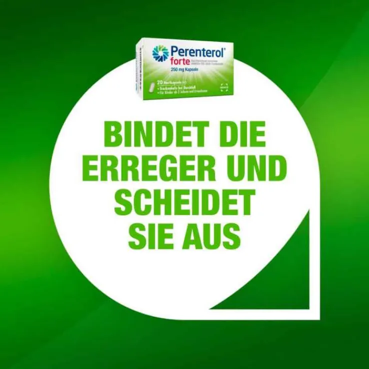 Perenterol® forte 250 mg Kapseln. Wirkstoff: Trockenhefe aus Saccharomyces cerevisiae HANSEN CBS 5926 (Synonym: Saccharomyces boulardii). Anwendungsgebiete: Zur Behandlung der Beschwerden bei akuten Durchfallerkrankungen, zur Vorbeugung und Behandlung der Beschwerden von Reisedurchfällen sowie Durchfällen unter Sondenernährung. Zur begleitenden Behandlung bei länger bestehenden Formen der Akne. Für Erwachsene und Kinder ab 2 Jahren. Warnhinweis: Enthält Lactose. Zu Risiken und Nebenwirkungen lesen Sie die Packungsbeilage und fragen Sie Ihre Ärztin, Ihren Arzt oder in Ihrer Apotheke.Stand: 08/2024. MEDICE Arzneimittel, 58638 Iserlohn.