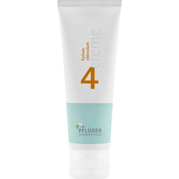 Biochemie Pflüger® Creme Nr. 4 Kalium chloratum.Wirkstoff: Kalium chloratum Trit. D4 0,1 g.Registriertes homöopathisches Arzneimittel, daher ohne Angabe einer therapeutischen Indikation. Gegenanzeigen: Überempfindlichkeit (Allergie) gegen den Wirkstoff oder einen der sonstigen Bestandteile, Anwendung im und am Auge, Anwendung auf den Schleimhäuten, Anwendung auf geschädigter Haut, Kinder unter 4 Jahren. Nebenwirkungen: keine bekannt. Creme enthält Propylenglycol und Cetylstearylalkohol. Packungsbeilage beachten. Zu Risiken und Nebenwirkungen lesen Sie die Packungsbeilage und fragen Sie Ihre Ärztin, Ihren Arzt oder in Ihrer Apotheke. Homöopathisches Laboratorium Alexander Pflüger GmbH & Co. KG · 33378 Rheda-Wiedenbrück · [email protected] · www.pflueger.de