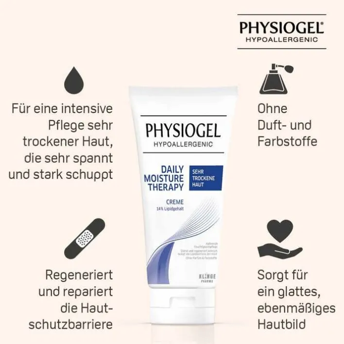 Die Physiogel Daily Moisture Therapy Creme für sehr trockene Haut (mit 14 % Lipidgehalt) ist für Menschen mit sehr trockener und empfindlicher Haut formuliert und kann daher auch für Allergiker geeignet sein. Sie enthält keine Duft- und Farbstoffe, die häufig allergische Reaktionen auslösen können. Zudem wurde die Creme klinisch getestet und unter dermatologischer Kontrolle geprüft, um die Hautverträglichkeit zu gewährleisten.