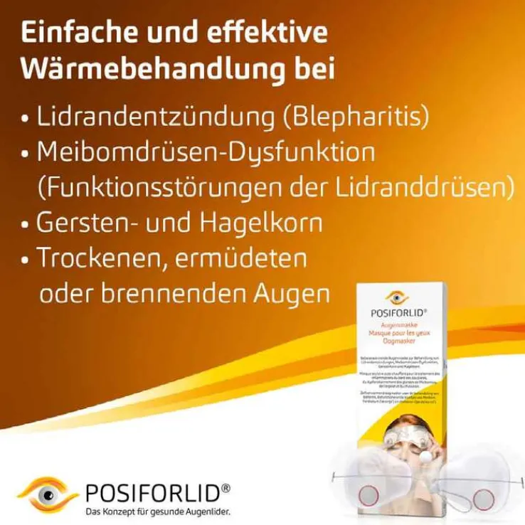 Die POSIFORLID® Augenmaske dient der einfachen und effektiven Wärmebehandlung bei Blepharitis und Meibomdrüsen-Dysfunktion. Darüber hinaus ist sie auch zur Behandlung bei Gersten- und Hagelkorn geeignet. Die zur Wärmebehandlung erforderliche Temperatur wird konstant und langanhaltend (ca. 45 °C über 10 Minuten) gehalten. Jede Augenmaske ist ca. 90-mal wiederverwendbar.