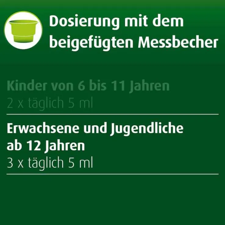 | Erwachsene und Jugendliche ab 12 Jahren | 5 ml entspr. 35 mg EfeublätterTrockenextrakt | 15 ml (3-mal 5 ml) entspr. 105 mg Efeublätter-Trockenextrakt |