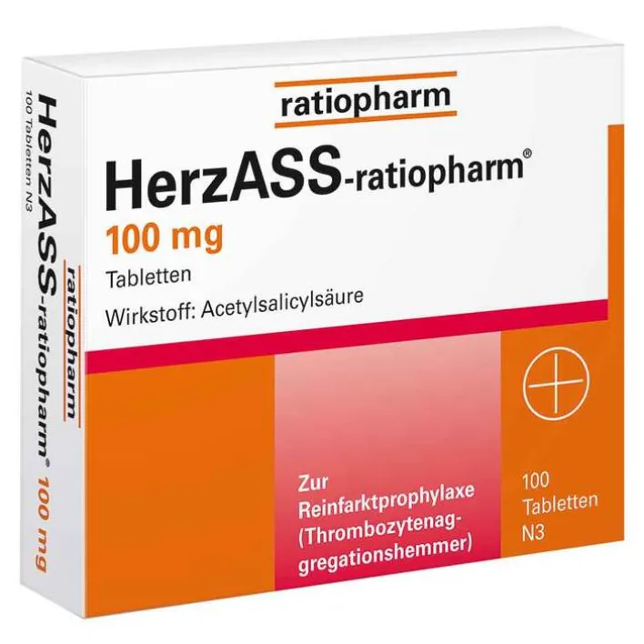 HerzASS-ratiopharm® 100 mg. Wirkstoff: Acetylsalicylsäure. Anwendungsgebiete: Instabile Angina pectoris (Herzschmerzen aufgrund von Durchblutungsstörungen in den Herzkranzgefäßen) – als Teil der Standardtherapie, akuter Herzinfarkt – als Teil der Standardtherapie, zur Vorbeugung eines weiteren Herzinfarktes nach erstem Herzinfarkt (Reinfarktprophylaxe), nach Operationen oder anderen Eingriffen an arteriellen Blutgefäßen (nach arteriellen gefäßchirurgischen oder interventionellen Eingriffen, z. B. nach aortokoronarem Venenbypass [ACVB], bei perkutaner transluminaler koronarer Angioplastie [PTCA]), zur Vorbeugung von vorübergehender Mangeldurchblutung im Gehirn (TIA: transitorischen ischämischen Attacken) und Hirninfarkten, nachdem Vorläuferstadien (z. B. vorübergehende Lähmungserscheinungen im Gesicht oder der Armmuskulatur oder vorübergehender Sehverlust) aufgetreten sind. Hinweis: Nicht geeignet zur Behandlung von Schmerzzuständen. Apothekenpflichtig. Zu Risiken und Nebenwirkungen lesen Sie die Packungsbeilage und fragen Sie Ihre Ärztin, Ihren Arzt oder in Ihrer Apotheke. 1/25.