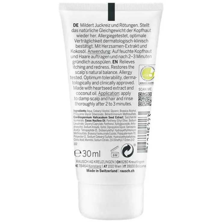 Die silikonfreie und vegane Spülung enthält keinerlei Farbstoffe und besteht zu 96 % aus Inhaltsstoffen natürlichen Ursprungs – darunter naturreines Kokosöl sowie wertvoller Herzsamen-Extrakt. Die optimale Verträglichkeit ist dermatologisch-klinisch bestätigt und von Service Allergie Suisse mit dem aha! – Gütesiegel ausgezeichnet. Um die Kopfhaut nicht unnötig zu reizen, haben die Rausch Expertinnen in Kreuzlingen am Bodensee für die feuchtigkeitsspendende Spülung auch auf Parfüm verzichtet. Deshalb duftet sie nur ganz dezent nach Noten von Vanille, Baumwolle und Kokosnuss.