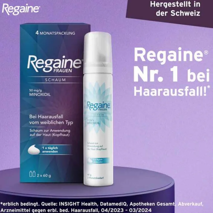 Regaine® Frauen Schaum. Wirkstoff: Minoxidil. Anwendungsgebiete: Regaine® Frauen Schaum stabilisiert bei Frauen den Verlauf der androgenetischen Alopezie vom weiblichen Typ (charakteristische anlagebedingte diffuse Kopfhaarverdünnung im Scheitelbereich). Die Behandlung mit Regaine® Frauen Schaum fördert das Haarwachstum u. kann so dem Fortschreiten dieses Haarverlustes entgegenwirken. Zu Risiken und Nebenwirkungen lesen Sie die Packungsbeilage und fragen Sie Ihre Ärztin, Ihren Arzt oder in Ihrer Apotheke. Johnson & Johnson GmbH, 41470 Neuss. Stand: 07/2023