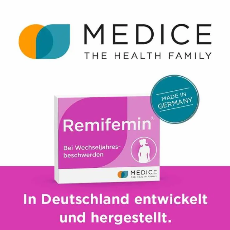 Remifemin®, Wirkstoff: Trockenextrakt aus Cimicifugawurzelstock. Anwendungsgebiete: Remifemin® wird angewendet zur Besserung der durch die Wechseljahre bedingten psychischen und neurovegetativen Beschwerden wie Hitzewallungen, Schweißausbrüche und Schlafstörungen. Warnhinweis: enthält Lactose. Packungsbeilage beachten. Zu Risiken und Nebenwirkungen lesen Sie die Packungsbeilage und fragen Sie Ihre Ärztin, Ihren Arzt oder in Ihrer Apotheke. Apothekenpflichtig. Stand: 11/2023. Schaper & Brümmer GmbH & Co. KG, Bahnhofstr. 35, 38259 Salzgitter