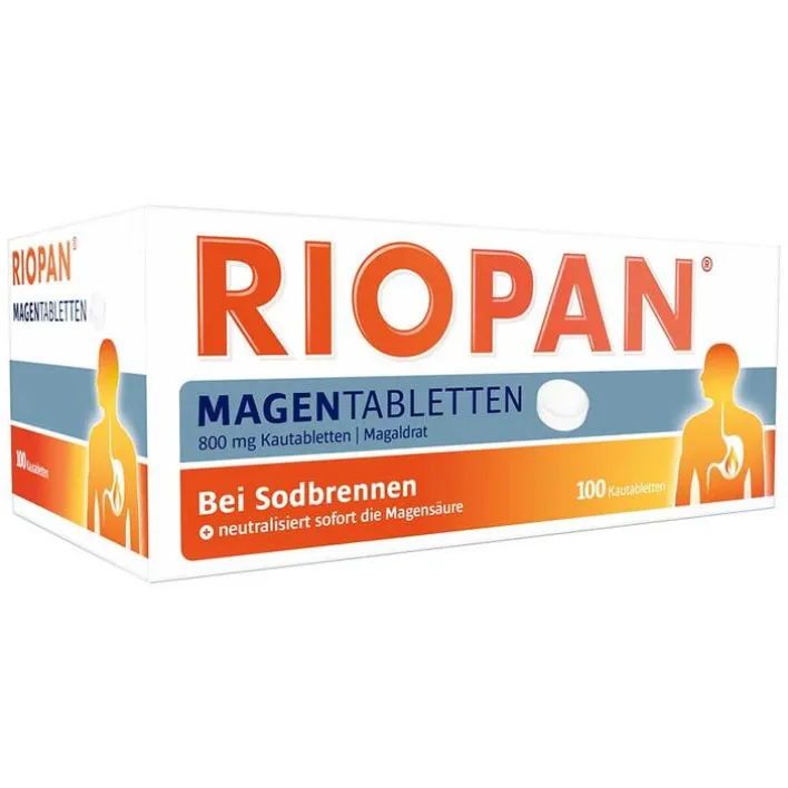RIOPAN® Magen Tabletten: 1 Kautablette enthält 800 mg wasserfreies Magaldrat. Anwendung: Sodbrennen und säurebedingte Magenbeschwerden; symptomatische Behandlung von Magen- und Zwölffingerdarmgeschwüren. Warnhinweise: Enthält Sorbitol. Packungsbeilage beachten. Weitere Hinweise siehe Fach- und Gebrauchsinfo. Zu Risiken und Nebenwirkungen lesen Sie die Packungsbeilage und fragen Sie Ihre Ärztin, Ihren Arzt oder in Ihrer Apotheke. Stand: 09/2019