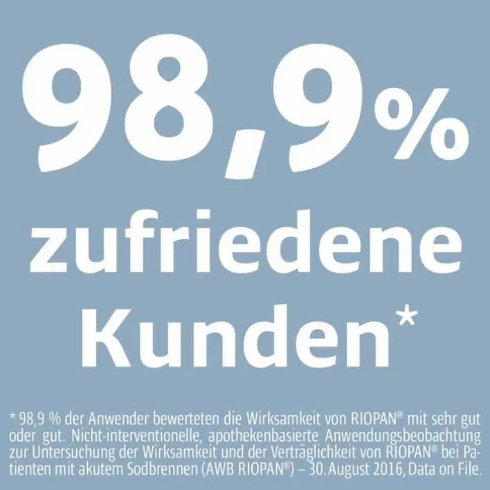 RIOPAN® Magen Tabletten Mint 800 mg Kautabletten: 1 Kautablette enthält 800 mg wasserfreies Magaldrat. Anwendung: Sodbrennen und säurebedingte Magenbeschwerden; symptomatische Behandlung von Magen- und Zwölffingerdarmgeschwüren. Warnhinweise: Enthält Sorbitol und Menthol. Packungsbeilage beachten. Weitere Hinweise siehe Fach- und Gebrauchsinfo. Zu Risiken und Nebenwirkungen lesen Sie die Packungsbeilage und fragen Sie Ihre Ärztin, Ihren Arzt oder in Ihrer Apotheke. Stand: 09/2019