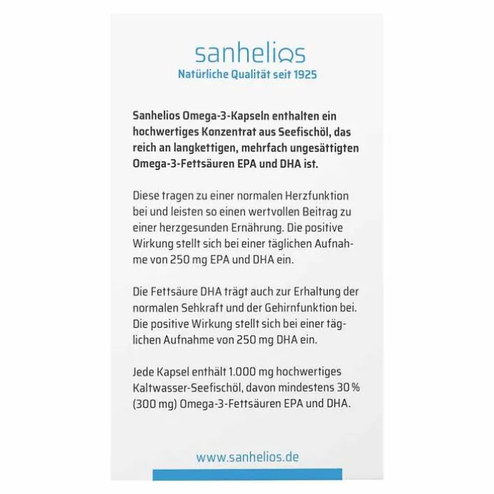 Sanhelios Omega-3-Kapseln enthalten ein hochwertiges Konzentrat aus Seefischöl, das reich an langkettigen, mehrfach ungesättigten Omega-3-Fettsäuren EPA und DHA ist. Diese tragen zu einer normalen Herzfunktion bei und leisten so einen wertvollen Beitrag zu einer herzgesunden Ernährung. Die positive Wirkung stellt sich bei einer täglichen Aufnahme von 250 mg EPA und DHA ein.