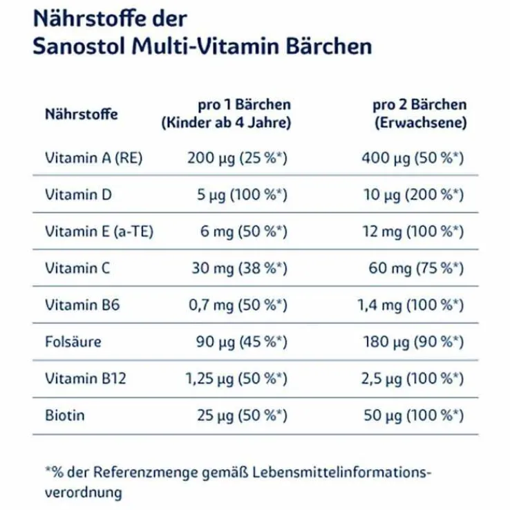 Die Sanostol Multi-Vitamin Bärchen sind ein Nahrungsergänzungsmittel, das lecker vitaminig nach Himbeere, Blaubeere und Orange schmeckt. Die Bären sind vegan, ohne Zucker und ohne Konservierungsstoffe – und natürlich mit 9 wichtigen Vitaminen. Einzunehmen sind täglich eins für Kinder ab 4 Jahren und bis zu zwei für Erwachsene.