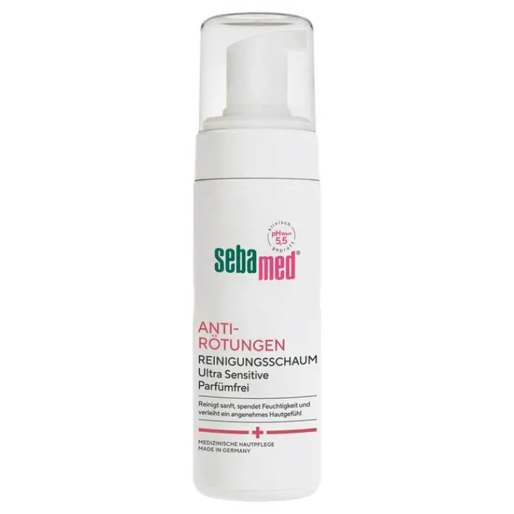 Der Sebamed Anti-Rötungen Reinigungsschaum ist parfumfrei und sanft. Er eignet sich als Rosacea Gesichtspflege und mindert Rötungen im Gesicht. Der Schaum ist ideal für die Pflege und Reinigung von geröteter Haut.