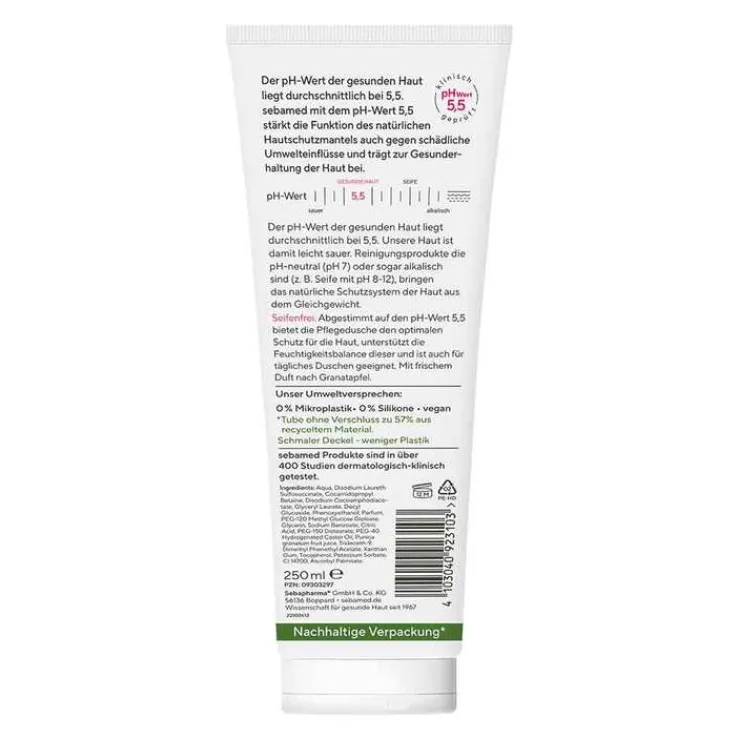 Das gesunde Wohlfühlerlebnis für empfindliche Haut – Die Sebamed Pflege-Dusche mit Granatapfel reinigt besonders schonend mit milden Zuckertensiden, stabilisiert die Feuchtigkeitsbalance der Haut, pflegt und erfrischt. Der pH-Wert 5,5 fördert den natürlichen Hautschutzmantel und unterstützt seine Barrierefunktion gegen Austrocknung und Reizungen
