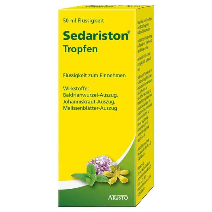 Sedariston® Tropfen (Apothekenpflichtig), Wirkstoffe: Auszüge aus Baldrianwurzeln, Johanniskraut und Melissenblättern. Anw.: Traditionelles pflanzliches Arzneimittel zur Besserung des Befindens bei nervlicher Belastung, zur Unterstützung des Schlafs ausschließlich auf Grund langjähriger Anwendung. Enthält 53 Vol.-% Alkohol. (Stand Sept. 2019) Aristo Pharma GmbH, Wallenroder Straße 8-10, 13435 Berlin.
