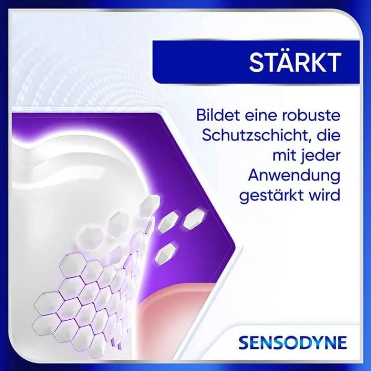 Die Sensodyne Zahnpasta bildet wissenschaftlich nachgewiesen eine mineralisierte Schutzschicht über den freiliegenden Dentinbereichen der Zähne und repariert so das Schutzschild, das empfindliche Zähne verloren haben.