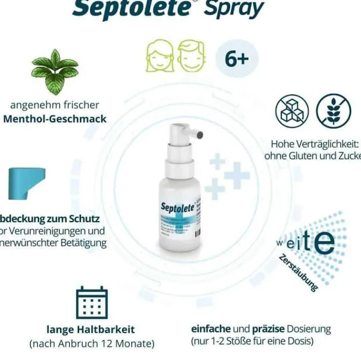 Das Septolete Spray ist ein antientzündliches Spray, dass bei Schmerzen und Entzündungen im Hals- und Rachenbereich, sowie zur Behandlung des Zahnfleisches als auch nach Zahnextraktionen angewendet werden kann.