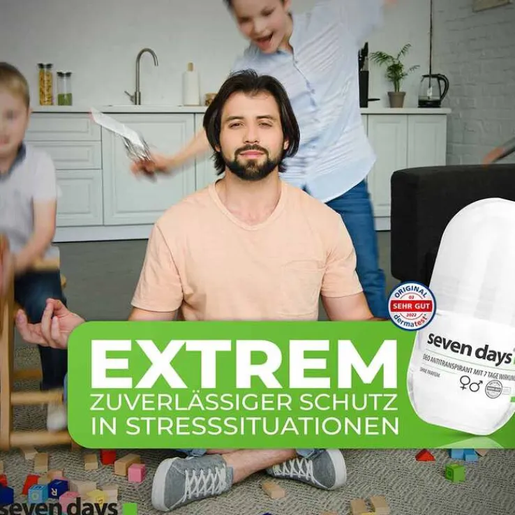 Durch die Regulierung der Schweißproduktion haben Bakterien weniger Nährboden und somit bildet sich kein unangenehmer Schweißgeruch. Seven Days ist sowohl für stressige Situationen als auch für den ganz normalen Alltag geeignet. Bereits ein einmaliges Auftragen sorgt für bis zu 7 Tage ohne Schweiß (instrumenteller Test). Mit seven days® bleibt die Kleidung trocken – kein unnötiges Verstecken mehr. Das Deo-Antitranspirant ist für Männer und Frauen geeignet. Ohne Parfüm. Weniger Schweiß zu einem günstigen Preis.