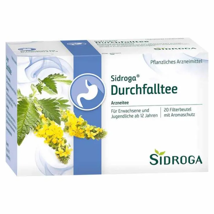 Sodroga Durchfalltee. Arzneitee (Filterbeutel). Wirkstoff: Odermennigkraut. Traditionelles pflanzliches Arzneimittel zur Anwendung bei leichten unspezifischen, akuten Durchfallerkrankungen, ausschließlich aufgrund langjähriger Anwendung. Zu Risiken und Nebenwirkungen lesen Sie die Packungsbeilage und fragen Sie Ihre Ärztin, Ihren Arzt oder in Ihrer Apotheke. Sidroga GfGmbH, 56130 Bad Ems