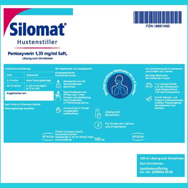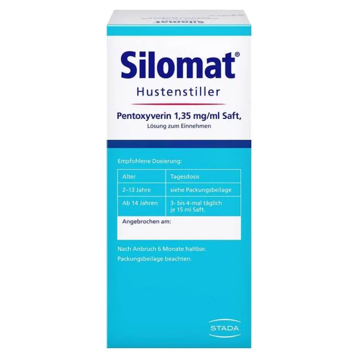 Silomat® Hustenstiller Pentoxyverin 1,35 mg/ml Saft, Lösung zum Einnehmen Zur Anwendung bei Erwachsenen und Kindern ab 2 Jahren. Wirkstoff: Pentoxyverincitrat. Arzneimittel zur symptomatischen Behandlung des Reizhustens (Antitussivum). Hinweis: Enthält Methyl- und Propyl-4-hydroxybenzoat, Sorbitol, Propylenglycol, Benzylalkohol und Natrium. Zu Risiken und Nebenwirkungen lesen Sie die Packungsbeilage und fragen Sie Ihre Ärztin, Ihren Arzt oder in Ihrer Apotheke. STADA Consumer Health Deutschland GmbH, Stadastraße 2-18, 61118 Bad Vilbel Stand: Juli 2024