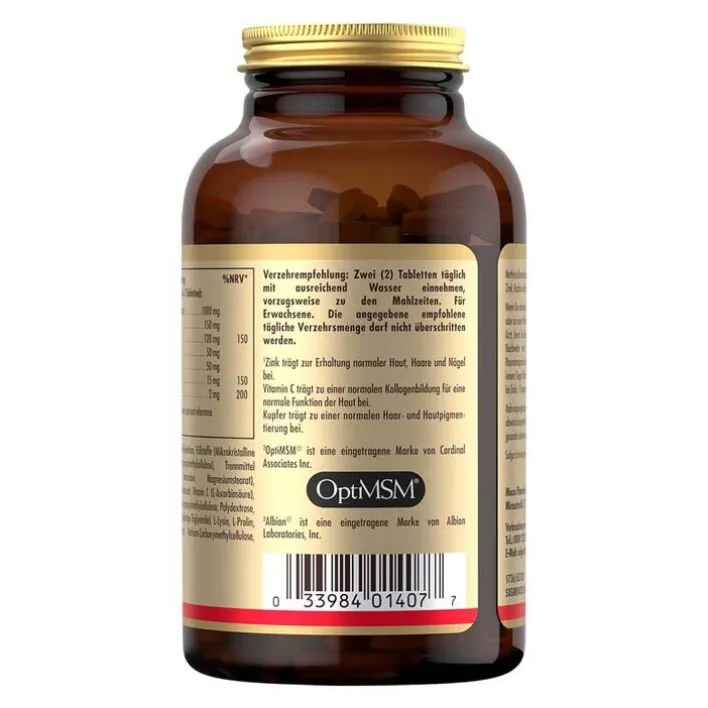 - Nahrungsergänzungsmittel mit MSM®, Rotalge, Vitamin C, L-Lysin, L-Prolin, Zink und Kupfer
