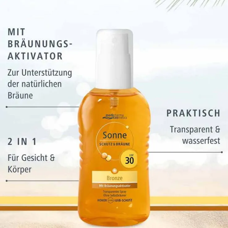 Das ultraleichte und transparente Sonnenspray Schutz & Bräune mit LSF 30 von Medipharma Cosmetics ist für Gesicht und Körper geeignet und bietet Sicherheit und Hautschutz auch bei intensiver Sonneneinstrahlung.