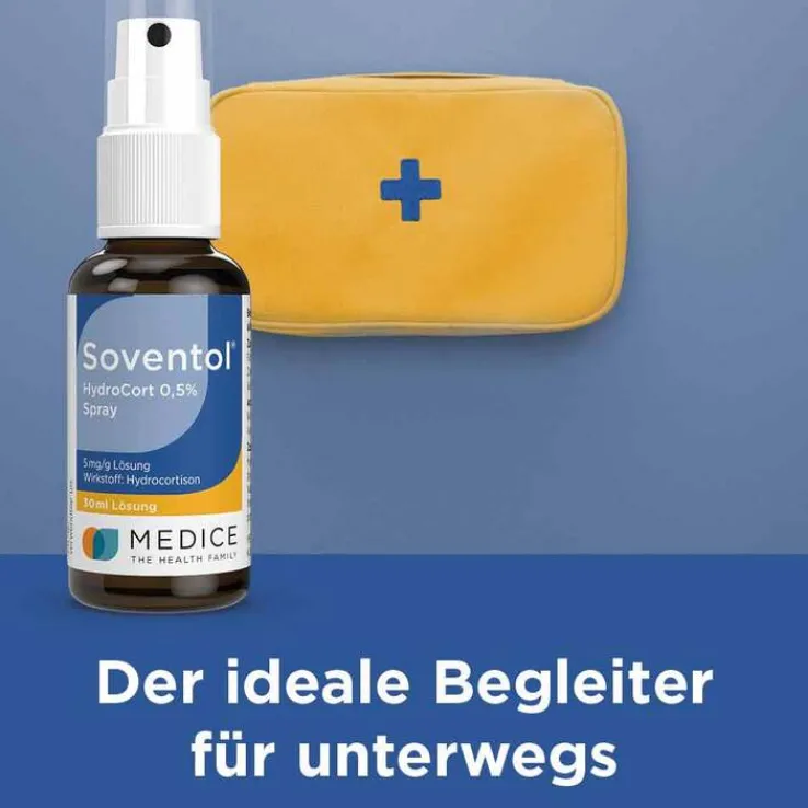 Soventol® HydroCort 0,5% Spray, 5 mg/g Lösung. Anwendungsgebiete: Zur Linderung von nicht infizierten leichten entzündlichen, allergischen oder juckenden Hauterkrankungen, die auf eine symptomatische Behandlung mit schwach wirksamen Glucocorticosteroiden ansprechen. Soventol® HydroCort 0,5% Spray eignet sich vorzugsweise zur Anwendung auf normaler oder fettiger Haut. Warnhinweise: Enthält Propylenglycol und Ethanol. Zu Risiken und Nebenwirkungen lesen Sie die Packungsbeilage und fragen Sie Ihre Ärztin, Ihren Arzt oder in Ihrer Apotheke. Stand 08/2022. MEDICE Arzneimittel, 58638 Iserlohn