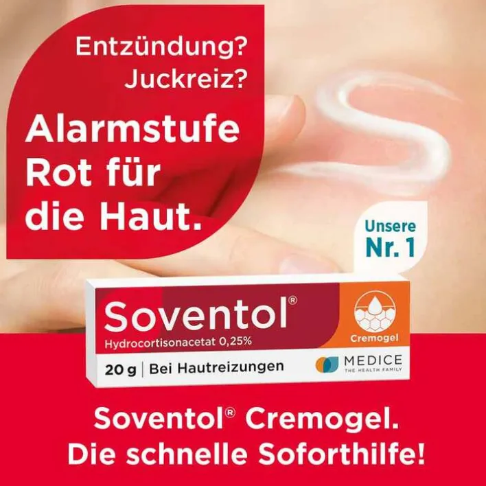 Soventol® Hydrocortisonacetat 0,25% 2,5 mg/g Creme. Anwendungsgebiete: Zur Behandlung von entzündlichen und allergischen Dermatosen (Hautentzündungen und Ekzeme) mit geringer bis mittlerer Symptomausprägung, die auf eine äußerliche Behandlung mit schwach wirksamen Corticosteroiden ansprechen. Zu Risiken und Nebenwirkungen lesen Sie die Packungsbeilage und fragen Sie Ihre Ärztin, Ihren Arzt oder in Ihrer Apotheke. Stand 07/2022. MEDICE Arzneimittel, 58638 Iserlohn