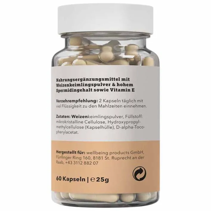 - Nahrungsergänzungsmittel mit Weizenkeimlingspulver, hohem Spermidingehalt und Vitamin E