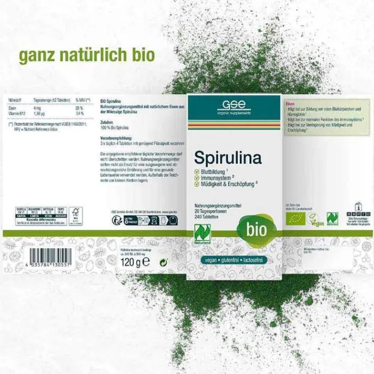 100 % Spirulina, ökologisch zertifiziert nach den privaten Richtlinien von Naturland, Deutschland