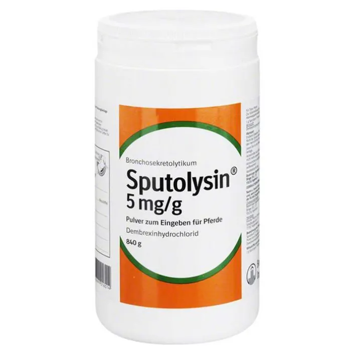 Sputolysin® 5 mg/g, Pulver zum Eingeben für Pferde, Dembrexinhydrochlorid. Zusammensetzung: 1 g Sputolysin® Pulver enthält Wirkstoff: 5,0 mg Dembrexinhydrochlorid x 1 H2O. Anwendungsgebiete: Sekretolytische Therapie bei Erkrankungen der Atemwege, die mit einer vermehrten Sekretion hyperviskösen Schleims einhergehen, wie katarrhalische Entzündungen der oberen Luftwege, akute, subakute und chronische Bronchitis. Gegenanzeigen: Lungenödem, beginnendes Lungenödem, gestörte Bronchomotorik, eingeschränkte Nieren- u./o. Leberfunktion. Nebenwirkungen: Keine bekannt. Wartezeit: Pferd: Essb. Gewebe: 3 Tage. Nicht bei Stuten anwenden, deren Milch für den menschl. Verzehr vorgesehen ist. [12.2011] Boehringer Ingelheim Vetmedica GmbH, 55216 Ingelheim