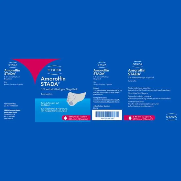 Amorolfin STADA® 5% wirkstoffhaltiger Nagellack. Wirkstoff: Amorolfin. Zur Behandlung bei Erwachsenen ab 18 Jahren von Pilzerkrankungen, die bis zu 2 Nägel und die vordere Hälfte oder die Ränder der Nägel betreffen. Hinweis: Dieses Produkt ist brennbar! Zu Risiken und Nebenwirkungen lesen Sie die Packungsbeilage und fragen Sie Ihre Ärztin, Ihren Arzt oder in Ihrer Apotheke. STADA Consumer Health Deutschland GmbH, Stadastraße 2-18, 61118 Bad Vilbel, Stand: Juli 2020