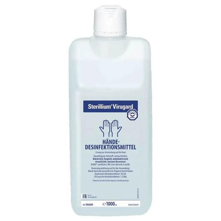 Sterillium® Virugard®. Wirkstoff: Ethanol. Anwendungsgebiete: Hygienische und chirurgische Händedesinfektion. Warnhinweise: Nicht in Kontakt mit offenen Flammen bringen. Nicht in der Nähe von Zündquellen verwenden. Flasche nach Gebrauch verschließen. Flammpunkt nach DIN 51755: 0 °C. Leicht entzündlich. Elektrostatische Aufladung vermeiden. Mit alkoholnassen Händen nichts berühren. Nach Verschütten des Desinfektionsmittels sind folgende Maßnahmen zu treffen: Sofortiges Aufnehmen der Flüssigkeit, Verdünnen mit viel Wasser, Lüften des Raumes sowie das Beseitigen von Zündquellen. Nicht rauchen. Ein etwaiges Umfüllen darf nur unter aseptischen Bedingungen (Sterilbank) erfolgen. Zu Risiken und Nebenwirkungen lesen Sie die Packungsbeilage und fragen Sie Ihre Ärztin, Ihren Arzt oder in Ihrer Apotheke. BODE Chemie GmbH, Melanchthonstraße 27, 22525 Hamburg