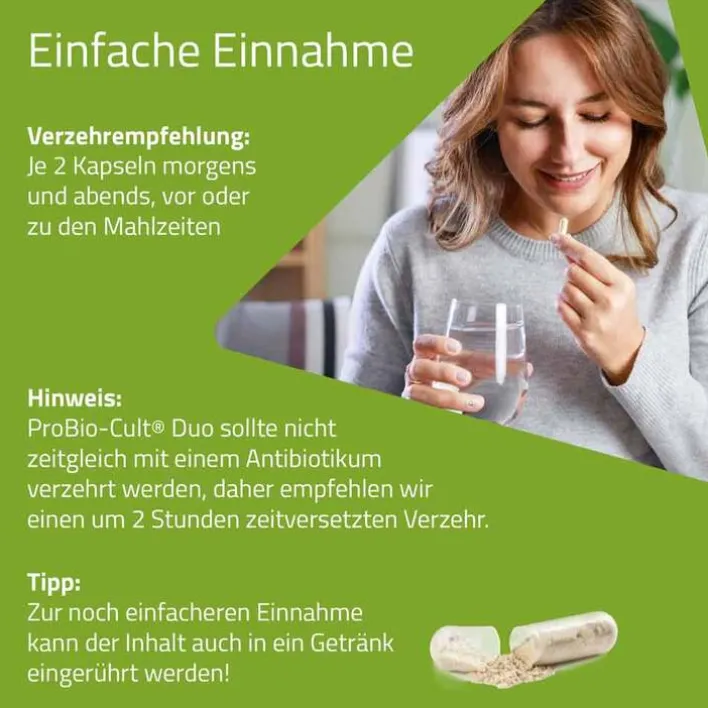 Mit 4 Kapseln ProBio-Cult Duo nehmen Sie 2,28 x 1010 (22,8 Milliarden Lebendkulturen) an Milchsäurebakterien zu sich.