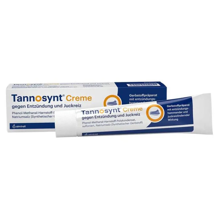 Tannosynt® Creme gegen Entzündung und Juckreiz. Wirkstoff: Phenol-Methanal-Harnstoff-Polykondensat, sulfoniert, Natriumsalz (Synthetischer Gerbstoff). Anwendungsgebiete: Zur unterstützenden Behandlung von Hauterkrankungen, die mit Entzündung, Nässen und Juckreiz verbunden sind. Warnhinweise: Cetylalkohol kann örtlich begrenzt Hautreizungen (z. B. Kontaktdermatitis) hervorrufen. Propylenglycol kann Hautreizungen hervorrufen. Zu Risiken und Nebenwirkungen lesen Sie die Packungsbeilage und fragen Sie Ihre Ärztin, Ihren Arzt oder in Ihrer Apotheke. Almirall Hermal GmbH• D-21462 Reinbek. www.almirall.de – e-mail:[email protected]