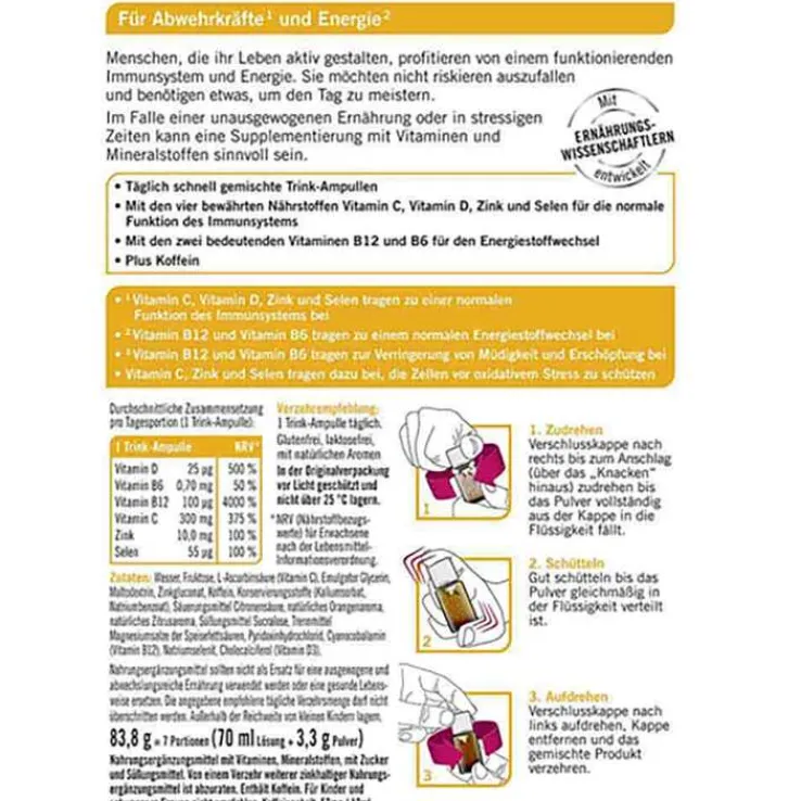 * Vitamin C, Vitamin D, Zink und Selen tragen zu einer normalen Funktion des Immunsystems bei. Vitamin B12 und Vitamin B6 tragen zu einem normalen Energiestoffwechsel bei. Vitamin B12 und Vitamin B6 tragen zur Verringerung von Müdigkeit und Erschöpfung bei. Vitamin C, Zink und Selen tragen dazu bei, die Zellen vor oxidativem Stress zu schützen.