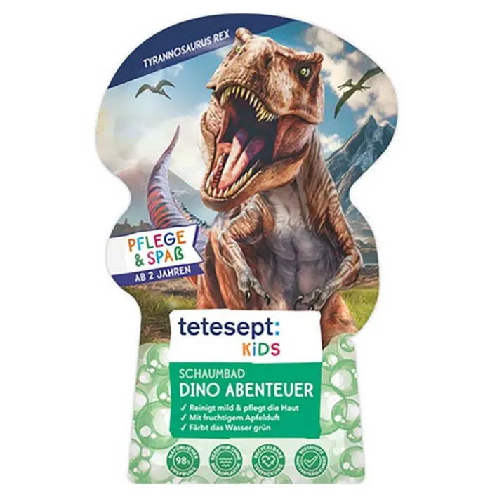 tetesept Kids Schaumbad Dino Abenteuer enthält eine extra sanfte, auf die empfindliche Kinderhaut abgestimmte Rezeptur mit hautpflegendem Aloe Vera. Lebensmittelfarbe färbt das Wasser grün, der fruchtige Apfelduft und die langanhaltenden Schaumwolken laden zum Baden ein.
