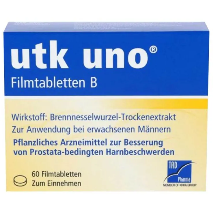 utk uno® Filmtabletten B. Wirkstoff: Trockenextrakt aus Brennesselwurzel. Anwendungsgebiete: utk uno® wird von Männern angewendet gegen Beschwerden beim Wasserlassen bei einer gutartigen Vergrößerung der Vorsteherdrüse (Prostata) im Stadium I bis II nach Alken bzw. II bis III nach Vahlensieck. Eine Behandlung mit utk uno® sollte nur nach ärztlicher Diagnose mit Ausschluss ernster Erkrankungen im Bereich der Harnwege erfolgen. Dieses Medikament behebt nicht die Vergrößerung der Prostata. Warnhinweis: Arzneimittel enthält Lactose. Präparat erst nach Rücksprache mit dem Arzt einnehmen, wenn eine Unverträglichkeit gegenüber bestimmten Zuckern vorliegt. Zu Risiken und Nebenwirkungen lesen Sie die Packungsbeilage und fragen Sie Ihre Ärztin, Ihren Arzt oder in Ihrer Apotheke. Stand: Mai 2012
