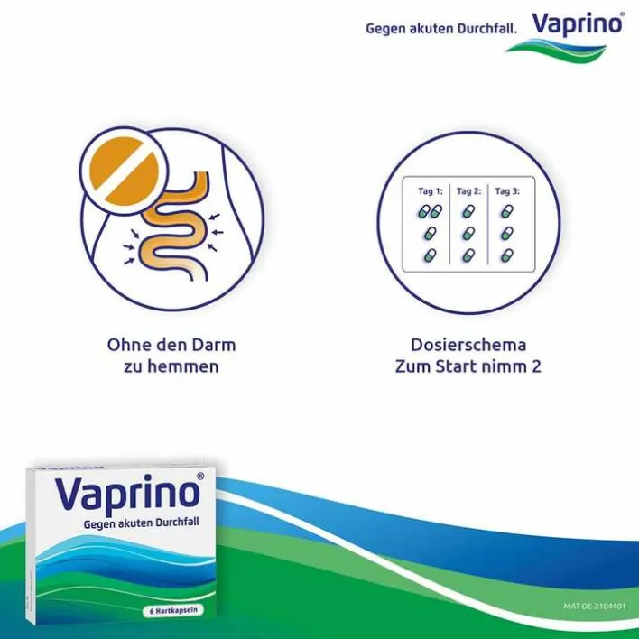 Vaprino® Gegen akuten Durchfall. Wirkstoff: Racecadotril 100 mg/ Hartkapsel. Anwendungsgebiet:Zur symptomatischen Behandlung des akuten Durchfalls bei Erwachsenen über 18 Jahren, sofern der Durchfall nicht ursächlich behandelt werden kann. Vaprino® Gegen akuten Durchfall kann zusätzlich zur ursächlichen Therapie eingenommen werden. Hinweis: Enthält Lactose. Zu Risiken und Nebenwirkungen lesen Sie die Packungsbeilage und fragen Sie Ihre Ärztin, Ihren Arzt oder in Ihrer Apotheke. A. Nattermann & Cie. GmbH, Brüningstraße 50, 65929 Frankfurt am Main. Stand: Juli 2022