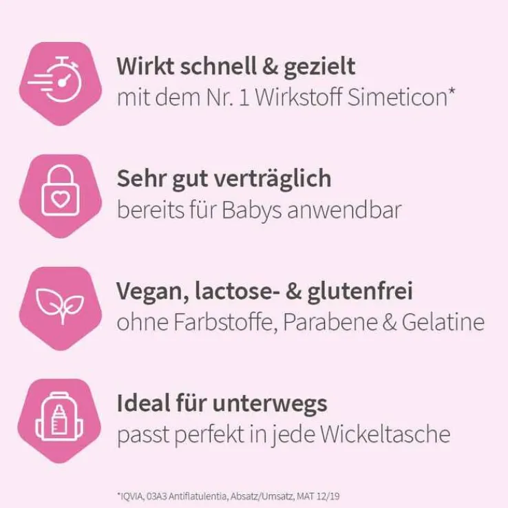 - Hilft schnell und gezielt bei Blähungen und Völlegefühl, Säuglingsblähungen (umgangssprachlich auch Säuglingskoliken oder Dreimonats-Koliken genannt) oder bei Luft im Bauch.