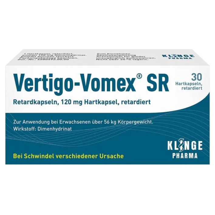 Vertigo-Vomex SR Retardkapseln, 120 mg Hartkapsel, retardiert: Wirkstoff: Dimenhydrinat. Anwendungsgebiet: Zur symptomatischen Behandlung von älteren Patienten mit Schwindel unterschiedlichen Ursprungs. Für Erwachsene über 56 kg Körpergewicht. Warnhinweise: Enthält Sucrose (Zucker). Arzneimittel f. Kinder unzugängl. aufbewahren. Stand: 07/21-2. Zu Risiken und Nebenwirkungen lesen Sie die Packungsbeilage und fragen Sie Ihre Ärztin, Ihren Arzt oder in Ihrer Apotheke. Klinge Pharma GmbH, 83607 Holzkirchen, Deutschland