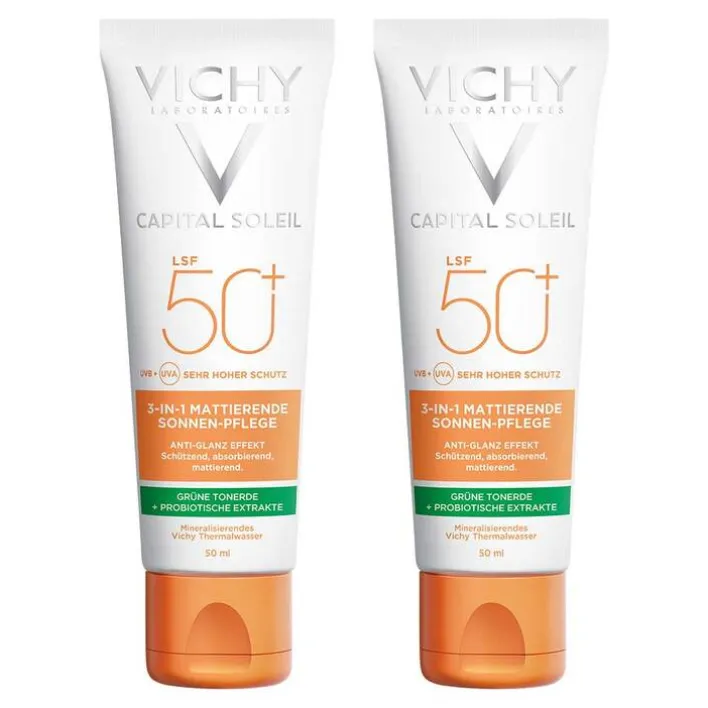 Die Vichy Capital Soleil 3-in-1 mattierende Sonnenpflege LSF 50+ ist eine Sonnencreme mit Anti-Glanz-Effekt für das Gesicht. Sie überzeugt mit einem 3-in-1 Effekt: absorbierend, mattierend und schützend. Die Formel mit Tonerde absorbiert überschüssige Fette und wirkt mattierend. Zusätzlich schützen das Vulkanische Wasser aus Vichy und ein probiotischer Extrakt gegen Anzeichen von fettiger Haut und stärken die Hautbarriere. Dank des Anti-Glanz-Effektes und hohen Sonnenschutzes dient die Sonnenpflege auch als eine perfekte Ergänzung zur Tagespflege.