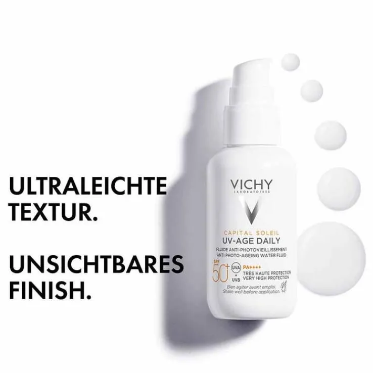 Die Capital Soleil UV-Age Daily LSF 50+ Sonnencreme von Vichy ist ein ultraleichtes Anti-Aging Fluid. Es schützt die Haut zuverlässig vor UVA- und UVB-Strahlen und wirkt sichtbar den Anzeichen der Hautalterung, wie Falten und dunklen Flecken, entgegen.