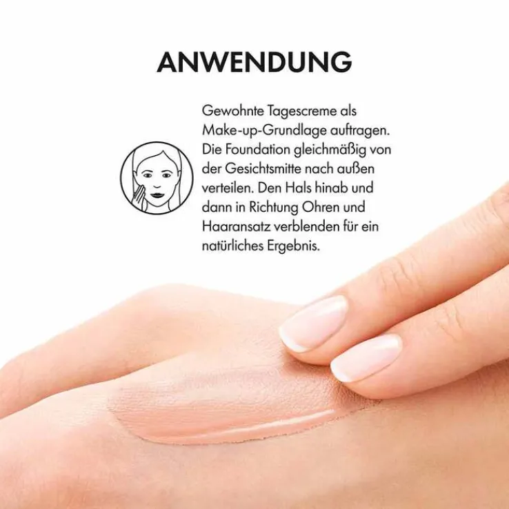 Nach dem Auftragen der gewohnten Tagespflege als Grundlage das Make-up mit den Fingerspitzen und sanft glättenden Bewegungen von der Gesichtsmitte nach aussen hin verteilen. Verstreichen Sie sorgfältig die Ränder an Hals, Ohren und Haaransatz, damit das Ergebnis perfekt natürlich wirkt.