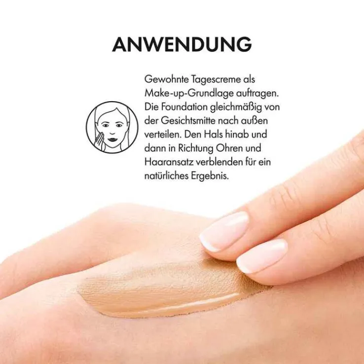Nach dem Auftragen der gewohnten Tagespflege als Grundlage das Make-up mit den Fingerspitzen und sanft glättenden Bewegungen von der Gesichtsmitte nach aussen hin verteilen. Verstreichen Sie sorgfältig die Ränder an Hals, Ohren und Haaransatz, damit das Ergebnis perfekt natürlich wirkt.