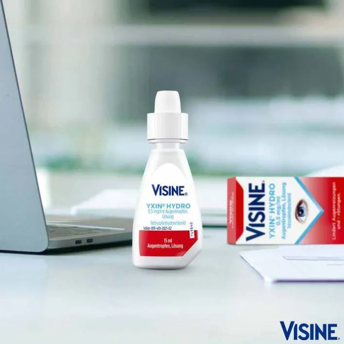 Visine® Yxin® Hydro 0,5 mg/ml Augentropfen.Wirkstoff: Tetryzolinhydrochlorid. Anwendungsgebiete: Zur vorübergehenden Schleimhautabschwellung bei nicht-infektiös bedingten Augenreizungen, z. B. durch Rauch, Staub, Wind, gechlortes Wasser, Licht oder bei Allergien, wie z. B. Heuschnupfen mit Augenbeteiligung, bei Erwachsenen, Jugendlichen und Kindern ab 6 Jahren. Kinder ab 2 Jahren und unter 6 Jahren sollten nur nach Rücksprache mit einem Arzt behandelt werden. Warnhinweis: Enthält Phosphate. Zu Risiken und Nebenwirkungen lesen Sie die Packungsbeilage und fragen Sie Ihre Ärztin, Ihren Arzt oder in Ihrer Apotheke. Johnson & Johnson GmbH, 41470 Neuss. Stand: 03/2022