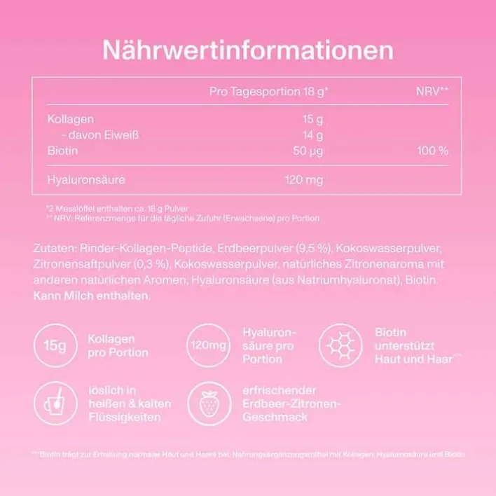 Rinder-Kollagen-Peptide, Erdbeerpulver (7,5 &), Inulin, Aroma, Zitronensaft (2,4 %), Kokoswasserpulver, Hyluronsäure (aus Natriumhyaluronat), Biotin.
