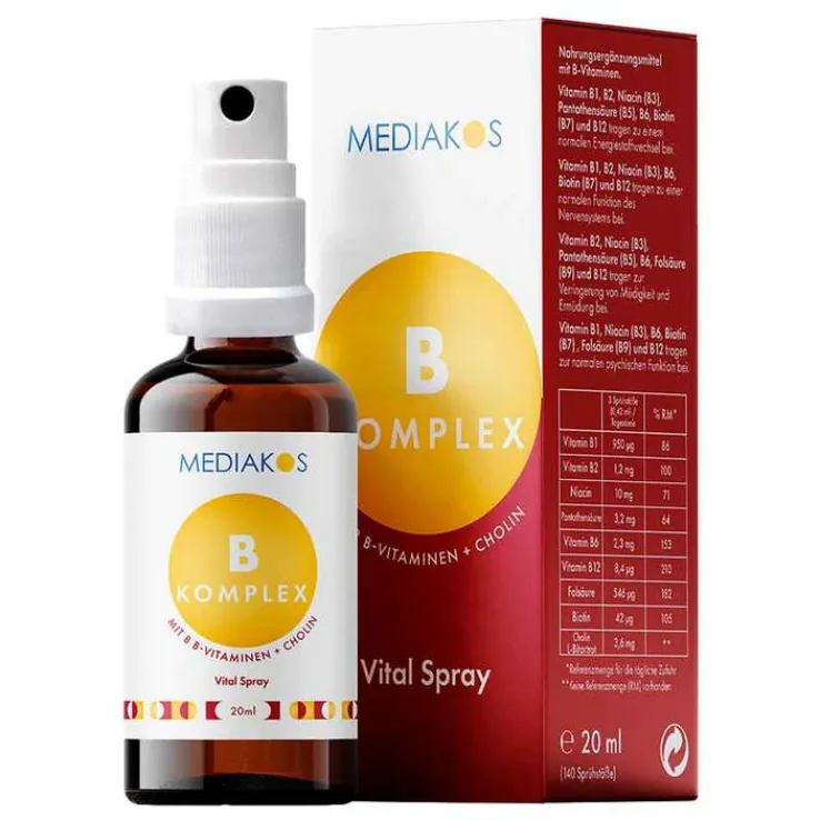 Vitamin B Komplex Mediakos Vital Spray ist ein Nahrungsergänzungsmittel, das die 8 B-Vitamine B1, B2, Niacin (B3), Pantothensäure (B5), B6, Biotin (B7) und B12 mit Folsäure (B9) und Cholin L-Bitartrat kombiniert. Dieser einzigartige Wirkstoffkomplex kann bei Müdigkeit unterstützen, liefert Energie und ist für Nerven und Psyche.*