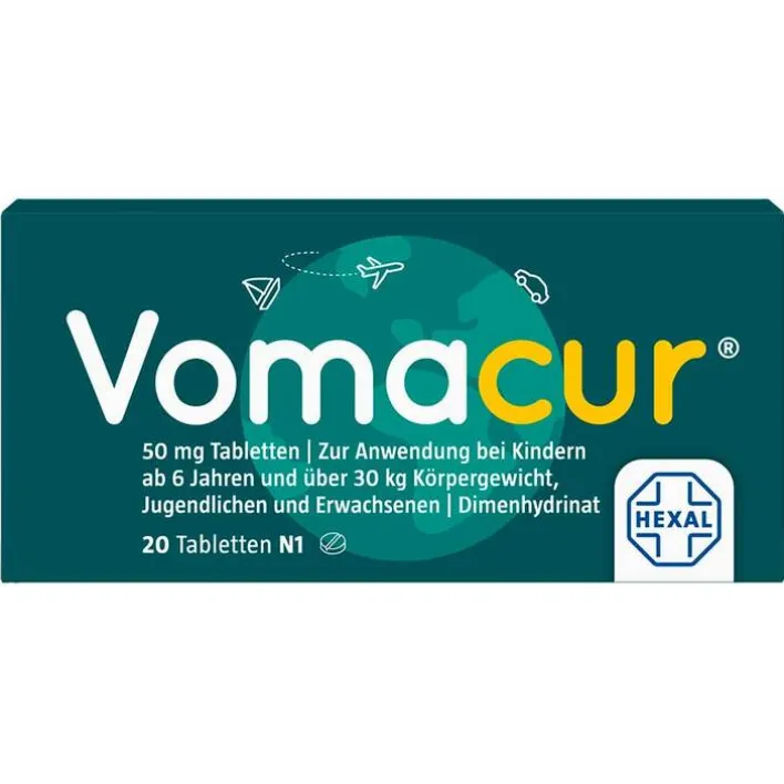Vomacur® 50 mg Tabletten. Wirkstoff: Dimenhydrinat. Anwendungsgebiete: Zur Vorbeugung und Behandlung von Reisekrankheit, Schwindel, Übelkeit und Erbrechen. Für Kinder ab 6 Jahren und über 30 kg Körpergewicht, Jugendliche und Erwachsene. Hinweis: Dimenhydrinat ist zur alleinigen Behandlung von Übelkeit und Erbrechen im Gefolge einer medikamentösen Krebsbehandlung (Zytostatika-Therapie) nicht geeignet. Warnhinweis: Enthält Lactose. Zu Risiken und Nebenwirkungen lesen Sie die Packungsbeilage und fragen Sie Ihre Ärztin, Ihren Arzt oder in Ihrer Apotheke. ! Mat.-Nr.: 2/51014522 Stand: April 2021. Hexal AG, 83607 Holzkirchen, www.hexal.de