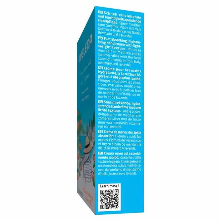 Ob unterwegs oder zuhause: Die Creme zieht ein, ohne dabei zu kleben oder ein fettiges Gefühl an den Händen zu hinterlassen. Ein Pflegefühl, das Sie direkt spüren können: Ihre Hände werden wunderbar weich und glatt gepflegt. Lassen Sie sich verzaubern von den mediterranen Vibes, dank des 100% natürlichen Dufts von roter Mandarine aus Italien, Rosmarin und Lavendel.